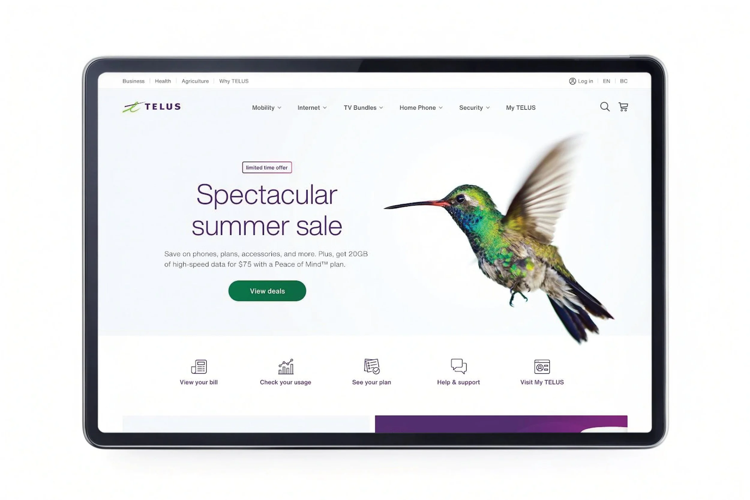 Fresh photography focused on highlighting all of the little details that the TELUS critters are known for—keeping charm and warmth at the heart of it. A refined palette was introduced, with an expanded set of gradients to work online and in-store. A new font for the ages was chosen, Helvetica Now, to tackle a larger range of viewpoints and uses, all with accessibility in mind.